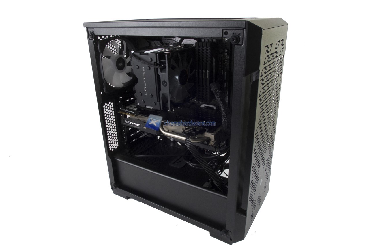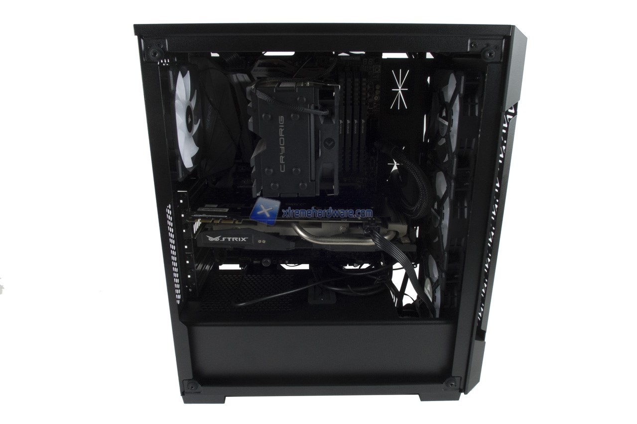 L’installazione nel Corsair iCUE 220T RGB è stata relativamente veloce. Lo spazio offerto è buono e i componenti vengono installati abbastanza velocemente. Forse lo spazio nel Top e con un dissipatore ad aria come nel nostro caso inizia a scarseggiare e si fa un po' di difficoltà ad inserire eventuali connettori per ventole o simili indi per cui si consiglia una configurazione con l’immancabile AIO. In caso di installazione di un AIO da massimo 360 mm potrete installare il radiatore nel frontale e grazie all’ampio foro nel tray della scheda madre completare l’installazione anche in seguito come di norma.