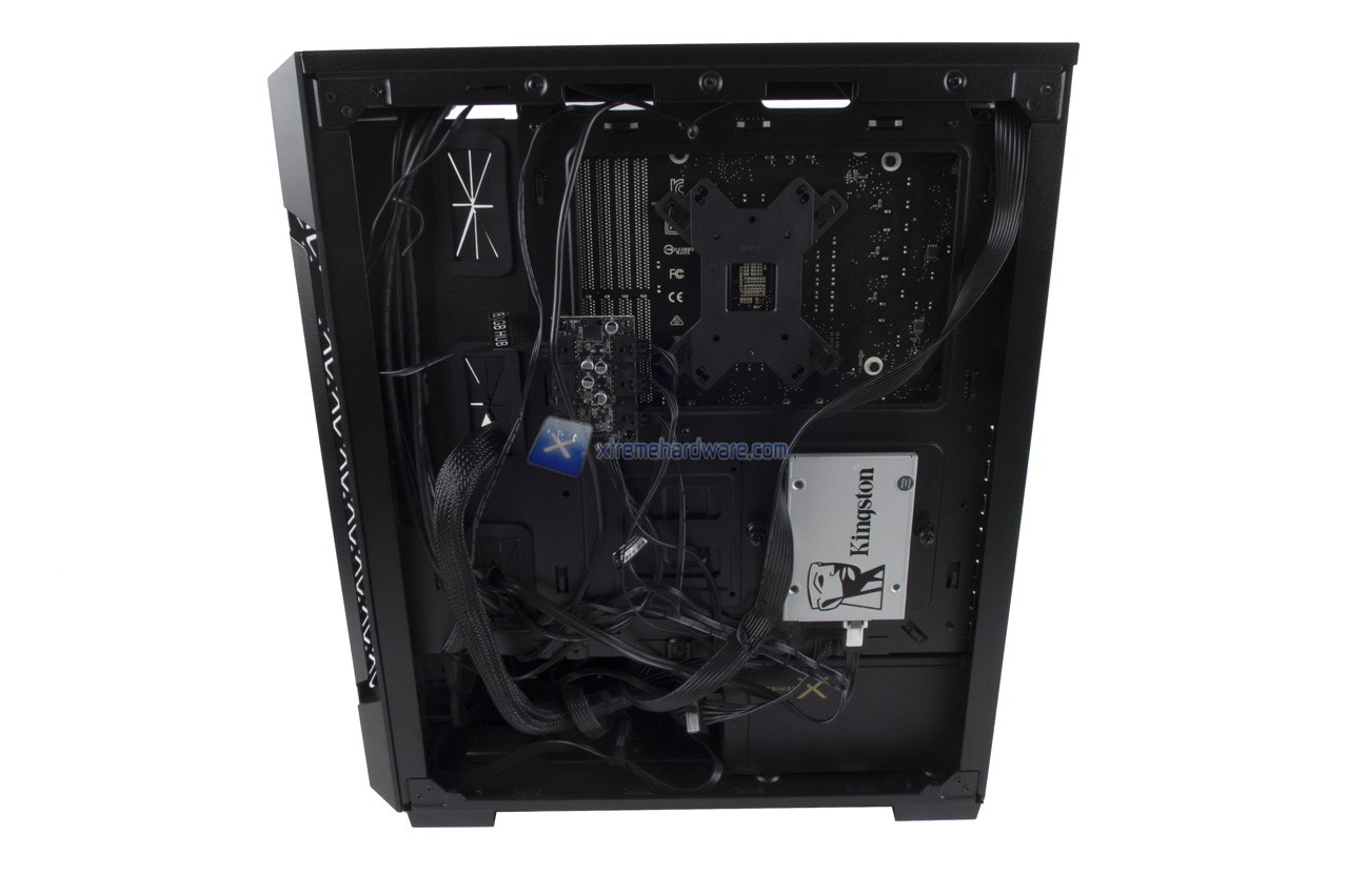 Gli SSD potrete installarli nel retro del case lato Tray scheda madre mentre quelli da 3,5’’ a meno di non utilizzare un PSU ATX con dimensioni inferiori verranno del tutto impossibilitati all’installazione. Almeno nel mio caso non sono riuscito a reinserire il cage per Hard Disk mantenendo un cablaggio decente. Ho dovuto dunque sacrificare il cage, anche se non lo utilizzo, per poter organizzare un minimo tutti i cavi dell’alimentatore.