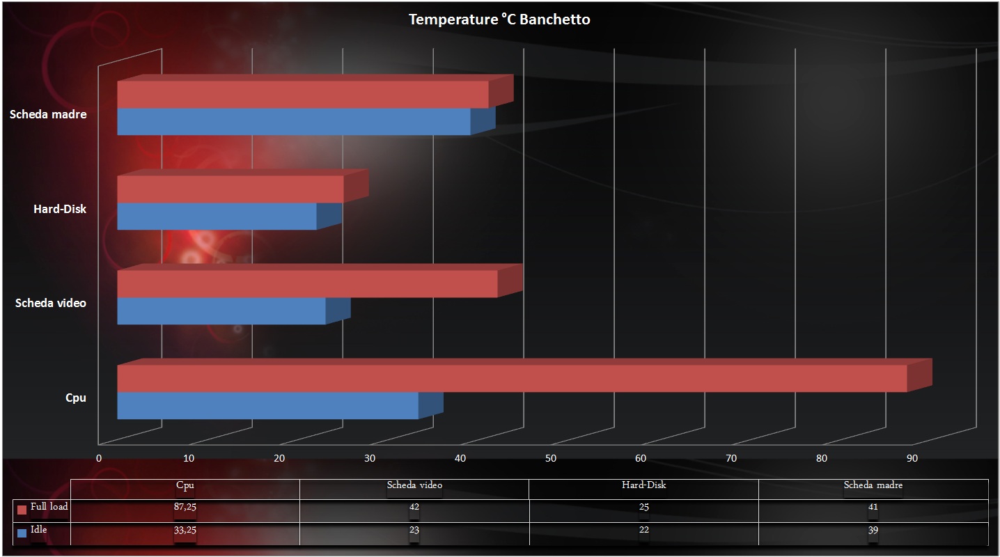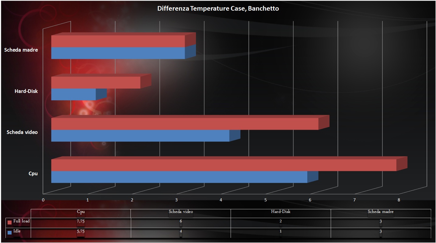 L'hard-disk, grazie alla ventola da 120mm frontale, riesce ad avere una  temperatura leggermente più bassa; in full-load guadagna circa -2°C e in idle -1°C. Infine le temperature della scheda madre rimangono quasi invariate, sia in full-load che non, l'aumento é di soli 3°C.