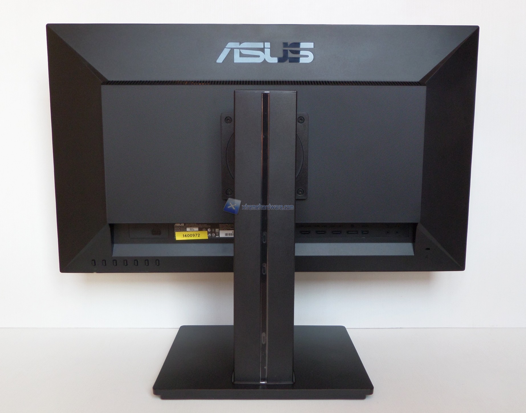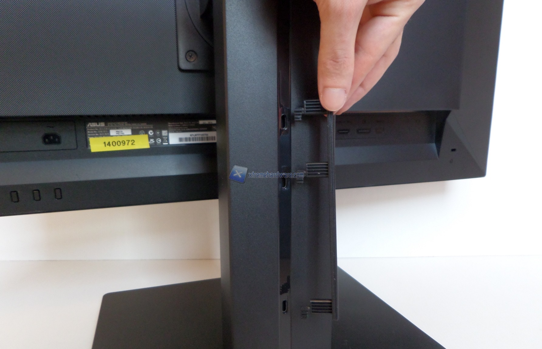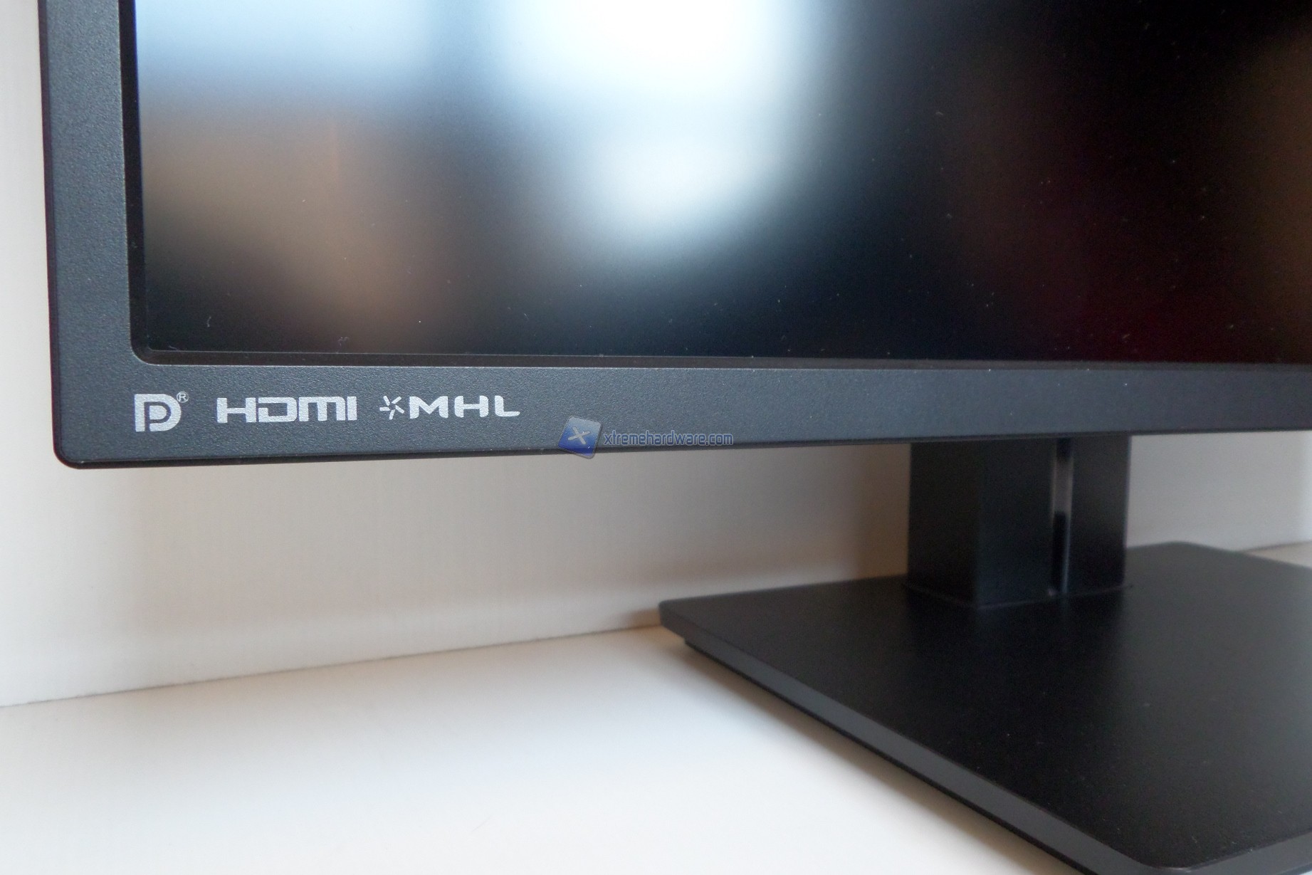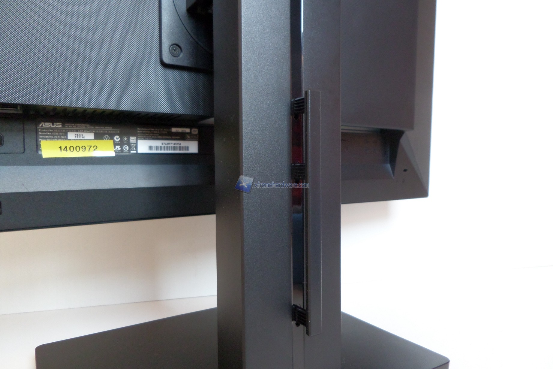 Lateralmente non sono presenti porte di connessione ed è davvero strano non trovare un hub USB per un monitor di questo livello e tipologia. Andiamo allora a dare un’occhiata alle spalle del monitor; "ehi, che ti aspettavi?" cit. Qui troviamo sia una trama liscia che particolareggiata ed è facilmente riscontrabile la presenza dei fori VESA 100x100 mm occupati dal braccio di regolazione. Sul sostegno sono presenti dei fori per poter inserire il raccoglitore cavi di plastica. Nella parte inferiore, a sinistra, si trova il connettore di alimentazione, mentre nell’altro lato troviamo ben quattro porte HDMI / MHL in versione 1.4, una DisplayPort 1.2 (non supporta l’Adaptive Sync), una mini DisplayPort e le connessioni audio per la linea di ingresso e l’uscita cuffie. Il monitor è dotato di due speaker audio da 2W ciascuno.