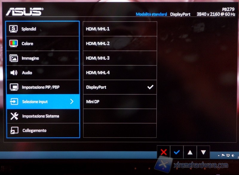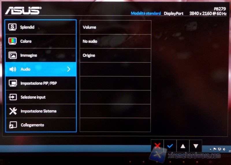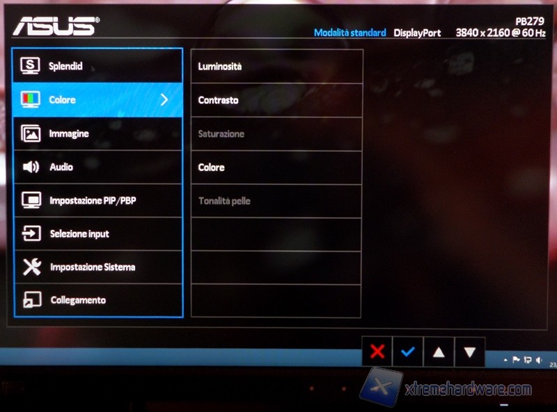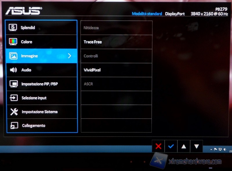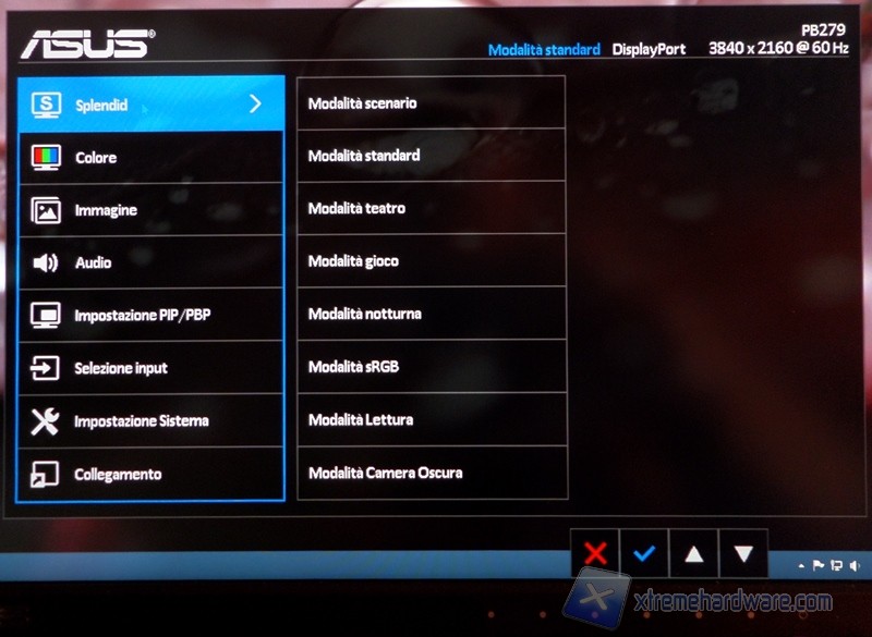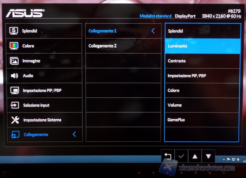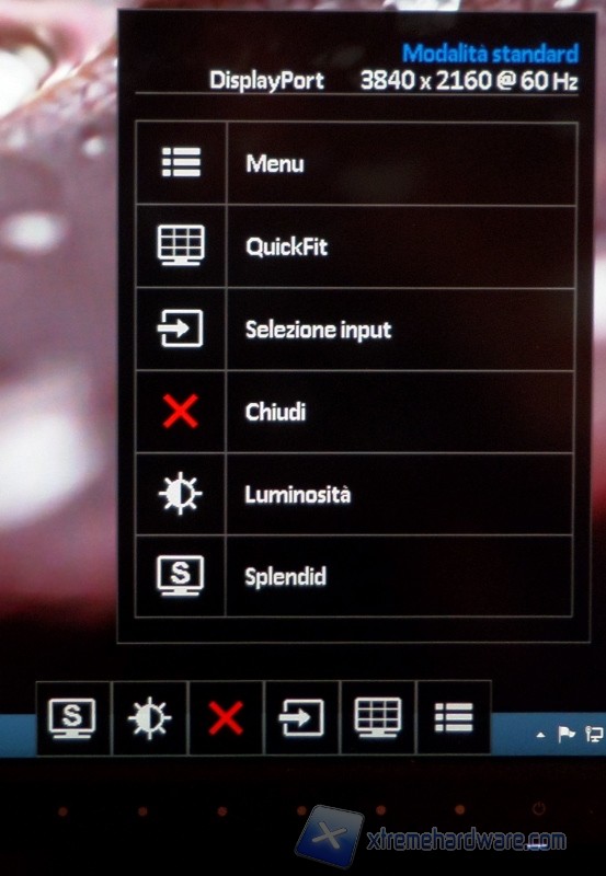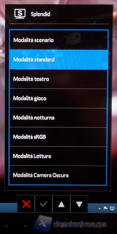 Alla pressione di un qualsiasi tasto si arriverà alla prima schermata rapida del menù OSD. Di default sono selezionate, come scelte rapide, le modalità di visione Splendid e la regolazione della luminosità. Queste potranno essere cambiate all’interno dello stesso menù nell’opzione Collegamento. Le modalità di visione Splendid disponibili sono: Scenario, Standard, Teatro, Gioco, Notturna, sRGB, Lettura e Camera Oscura. Le altre scelte rapide riguardano lo switch tra le sorgenti video e la modalità QuickFit. Questa presenta delle varie opzioni le quali riporteranno a schermo una griglia o il formato selezionato.