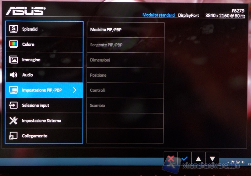 Dopo la regolazione e scelta della sorgente dell’audio si arriva al menù delle funzioni PiP e PbP: queste impostazioni sono state curate molto bene da ASUS. La modalità PiP (Picture in Picture) permette di regolare la grandezza della sorgente secondaria su Piccolo, Medio e Grande, oltre ovviamente a sceglierne il posizionamento in uno dei quattro angoli del monitor. La funzione PbP (Picture by Picture) permette invece la riproduzione contemporanea di quattro ingressi video, senza alcuna restrizione sulla scelta delle porte video. Queste poi potranno essere posizionate come indicato in figura.
