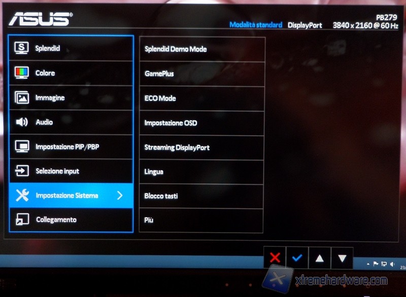 In Impostazione di Sistema troviamo la modalità Splendid Demo (per confrontare le modalità Splendid), GamePlus (per la scelta di un mirino e timer), l’opzione Streaming DisplayPort (che dovrà essere impostata in versione 1.2 per i 60Hz) e la possibilità di disattivare il LED di stato.